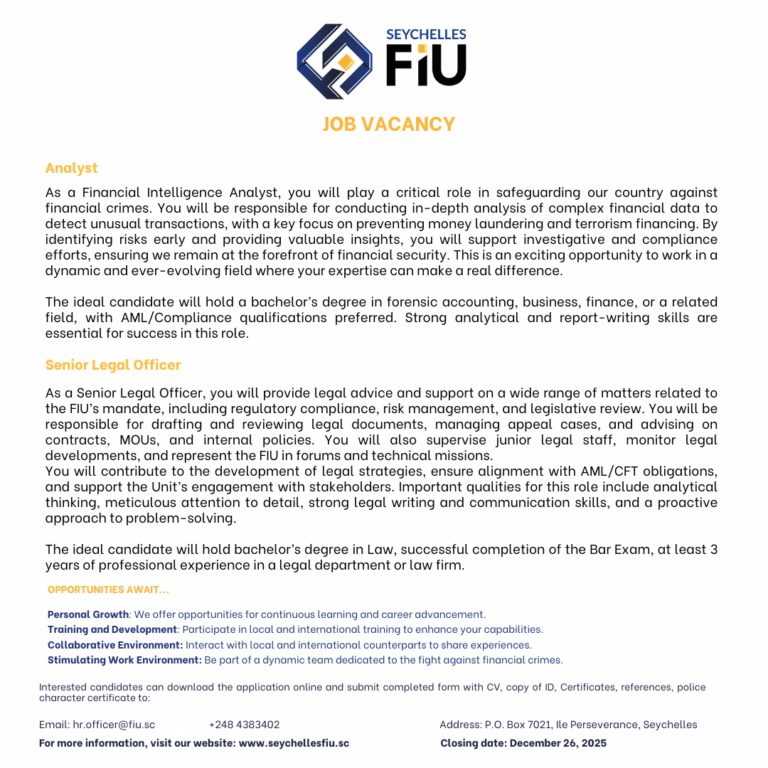 In view of the nature of work of the FIU, the Unit is collecting your personal information as part of its recruitment process. Employment checks such as a Security Clearance ensures that any vulnerabilities that would potentially put the Unit at risk are identified. Failure to provide requested information may prevent your application from being processed. All information provided will be treated as sensitive and confidential.